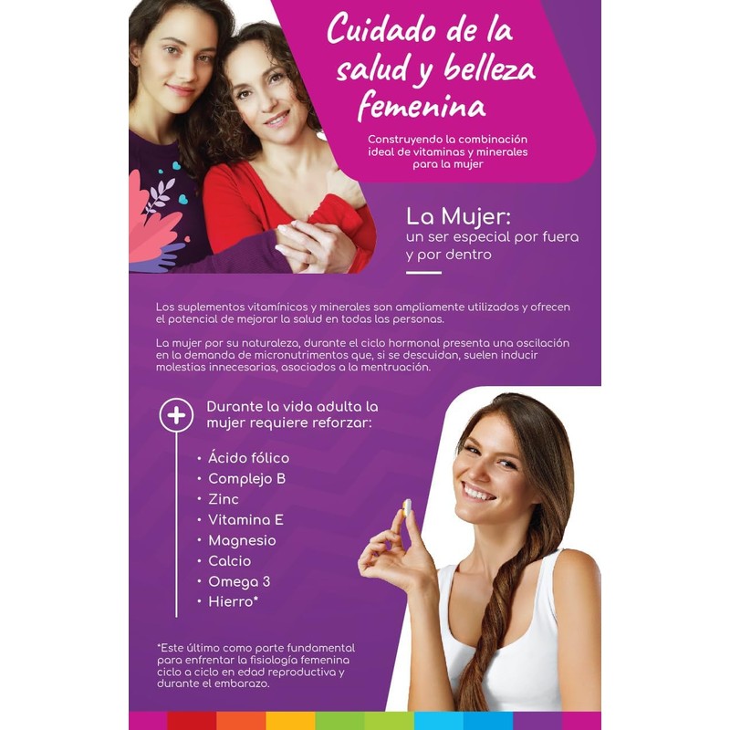 - Suplemento alimenticio con: Calcio, Vitamina D, Hierro, Zinc, Magnesio, Potasio, Vitamina A, Vitamina C, Vitamina E, Vitamina B1, Vitamina B2, Vitamina B3, Vitamina B5, Vitamina B6, Vitamina B9, Vitamina B12 Y Omega 3.