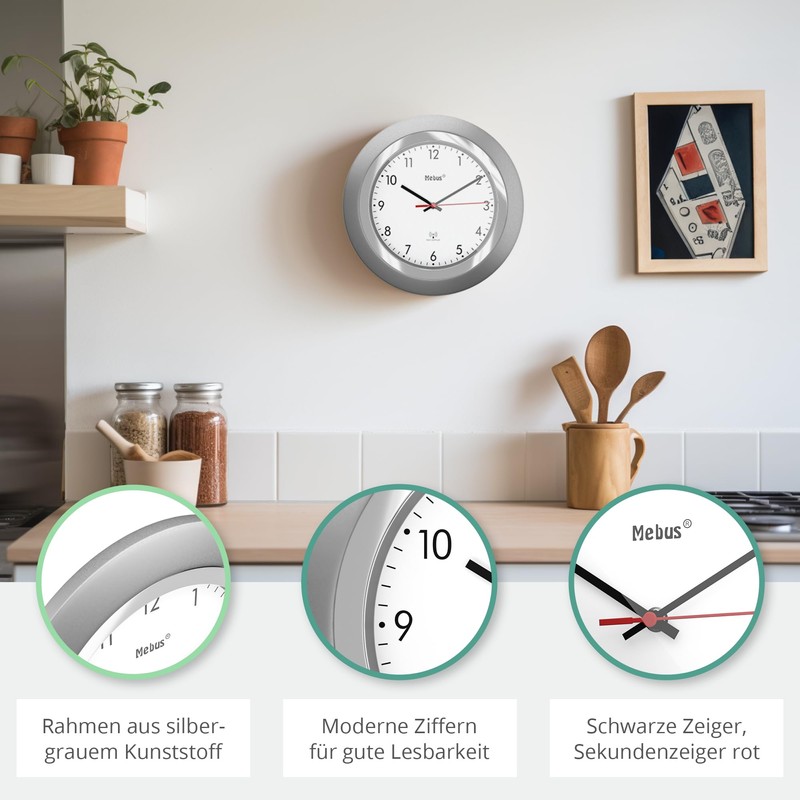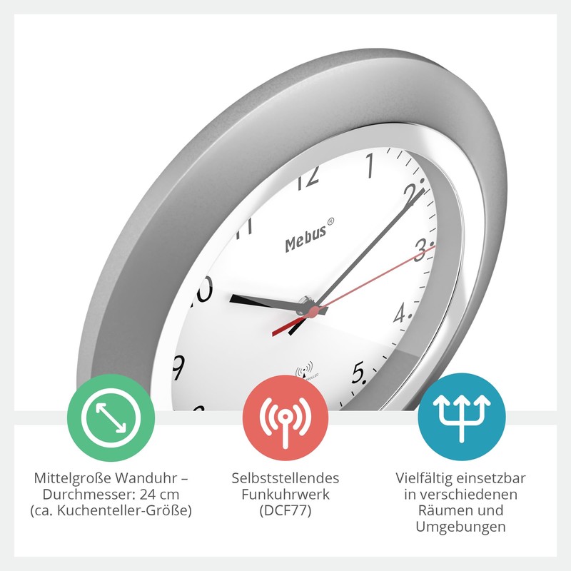 Mebus Radio Controlled Wall Clock, Classic Model, Silver Frame, White Dial, 24 cm Diameter, Round, Radio Controlled Clock (DCF77), Model: 19452, Colour: Silver, White
