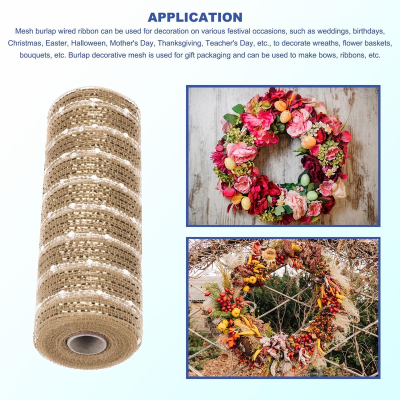 - Poly burlap mesh decorative mesh ribbon roll, applied to decorative flower mesh and gift wrapping. Mesh burlap wired ribbon can be used for decoration on various festival occasions, such as weddings, birthdays, Christmas, Easter, Halloween, Mother's Day, Thanksgiving, Teacher's Day, Anniversary, Engagement, Father's Day, New Year, Valentine's Day,etc., to decorate wreaths, flower baskets, bouquets, etc. Burlap decorative mesh is used for gift packaging and can be used to make bows, ribbons, etc.