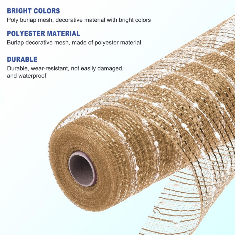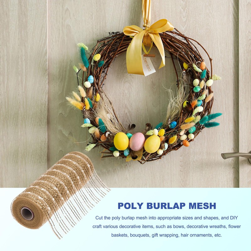 - Poly burlap mesh, decorative material with bright colors, used to decorate wreaths, bouquets, etc. in spring, summer, and fall, adding bright colors and natural texture; Burlap decorative mesh, made of polyester material, which is durable, wear-resistant, not easily damaged, and waterproof. Floral burlap mesh roll can be used outdoors in gardens, lawns, and other areas; Poly burlap decorative mesh can be cut, folded, and packaged for easy use, especially suitable for gift wrapping