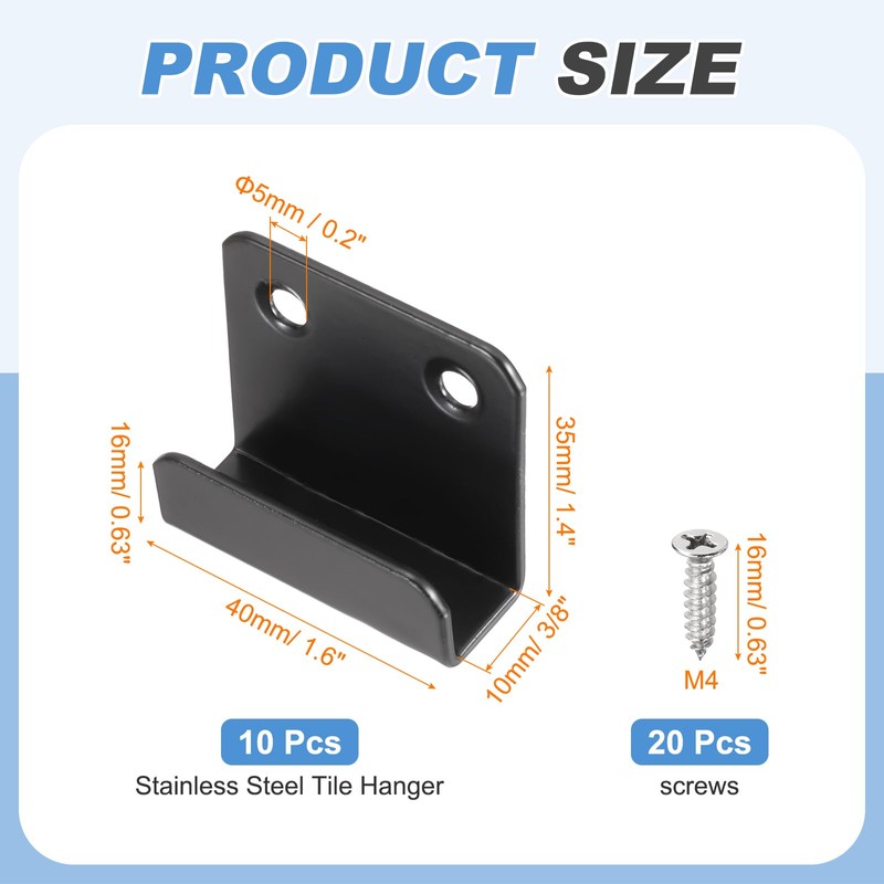 The overall size of the stainless steel tile hanger is 40 x 35mm/ 1.6 x 1.4 inch (L*H), the front height is 16mm/ 0.63 inch, and with an inner width of 10mm/ 3/8 inch, the hole diameter is 5mm / 0.2 inch. You can get 10 pieces Stainless Steel Tile Hanger and 20 pieces 4x16 screws.