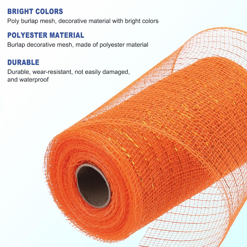 Poly burlap mesh, decorative material with bright colors, with glitter silk for a bright and sparkly feel and to provide good atmosphere,used to decorate wreaths, bouquets, etc. in spring, summer, and fall, adding bright colors and natural texture; Burlap decorative mesh, made of polyester material, which is durable, wear-resistant, not easily damaged, and waterproof. Floral burlap mesh roll can be used outdoors in gardens, lawns, and other areas; Poly burlap decorative mesh can be cut, folded, and packaged for easy use, especially suitable for gift wrapping