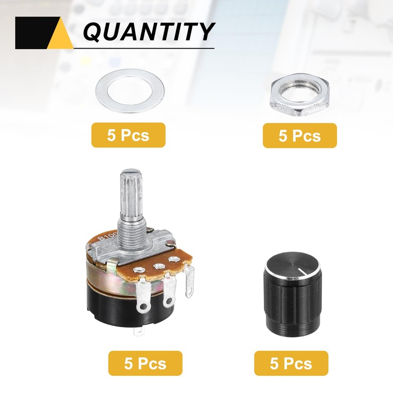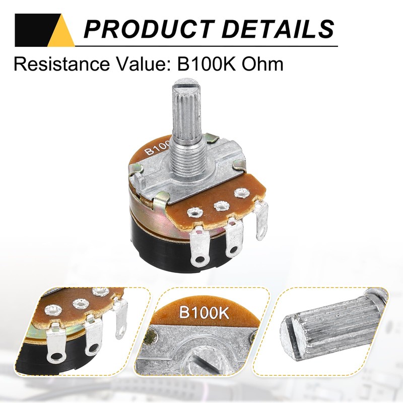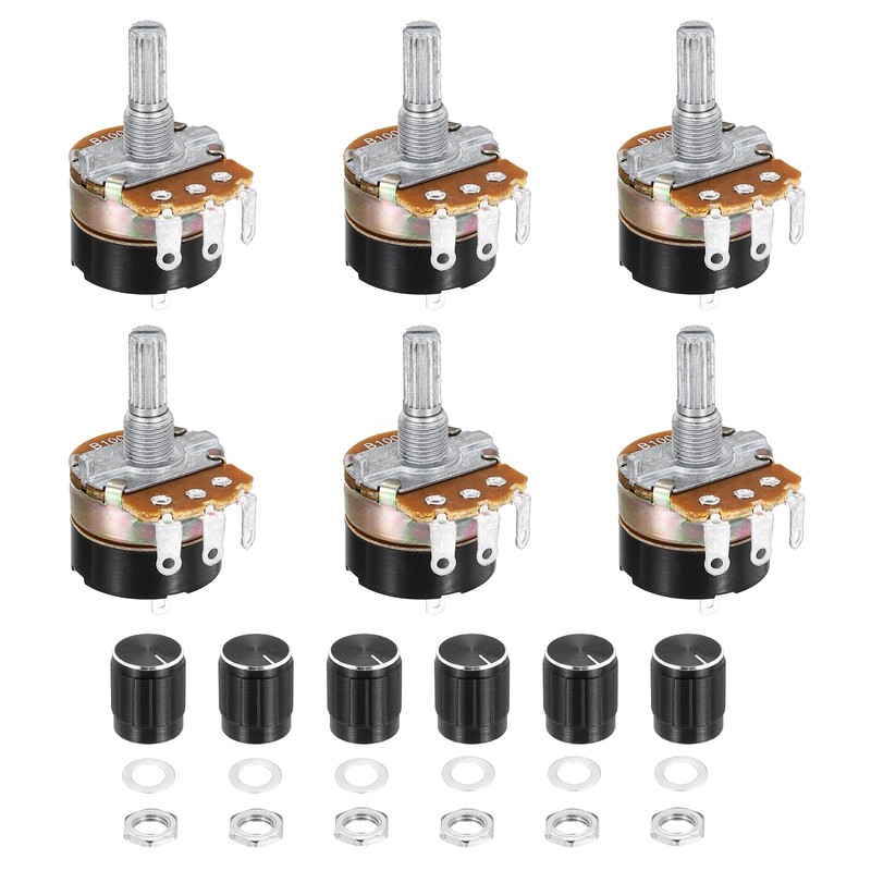 - Terminal: 3 Pin; Resistance Value: 100K Ohm(Tolerance±20%); Thread Size: M8 x 7mm(D*L); Shaft Size: ; Shaft Size: 6mm x 13mm/0.23 inch x 0.5 inch(D*L); Total Size: 24mm x 20mm/0.94 inch x 0.79 inch(D*H); Knob Size: 15mm x 17mm/0.59 inch x 0.67 inch(D*H); Package includes: 6 x Potentiometer