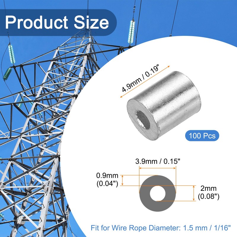 - The Crimping Loop Sleeve is in inner length: 2 mm / 0.08 inch; Outer Size: 4.9 x 3.9 x 0.9 mm / 0.19 x 0.15 x 0.04 inch (LxWxT); Fit for Wire Rope Diameter: 1.5 mm / 1/16"; In the package of 100 x Aluminum Wire Rope Stop Sleeve