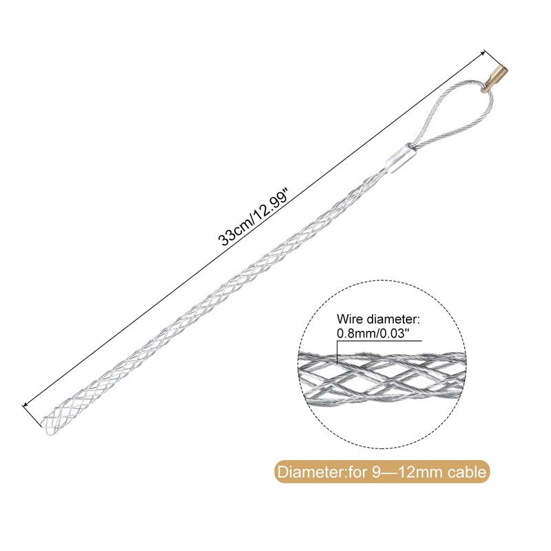 - The wire puller socks ,is in size of:Length:33cm(12.99 Inch);Wire diameter:0.8mm/0.03 inch;Diameter:for 9-12mm cable;Color:Silver;Material: galvanized steel;In the package of: 1 x Single Wire Mesh Puller Socks Grip;Nut hook length: 18mm, nut inner diameter: 4.2mm.