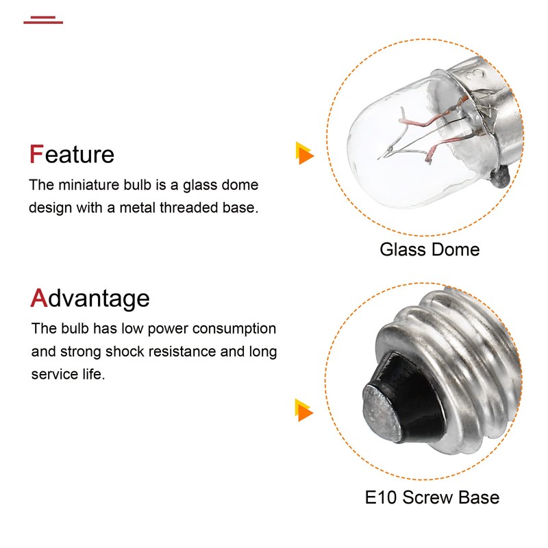 The E10 miniature bulb is a glass dome design with a metal threaded base. Widely used in flashlights, equipment indicators, instrumentation lights, signal lights, warning lights, Interior lights, microscope lights, circuit experiments, etc.