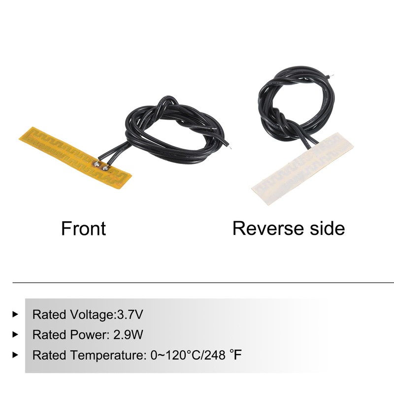 - Package Content: 4pcs x Heater Plate Adhesive Pad; Lead Wire Length: 300mm/12 inch; Heating Film Size(LxW): 41mmx8mm/1.61x0.31 inch; Rated Voltage: 3.7V; Rated Power: 2.9W; Rated Temperature: 0~120°C/248 ℉; Material: Polyimide