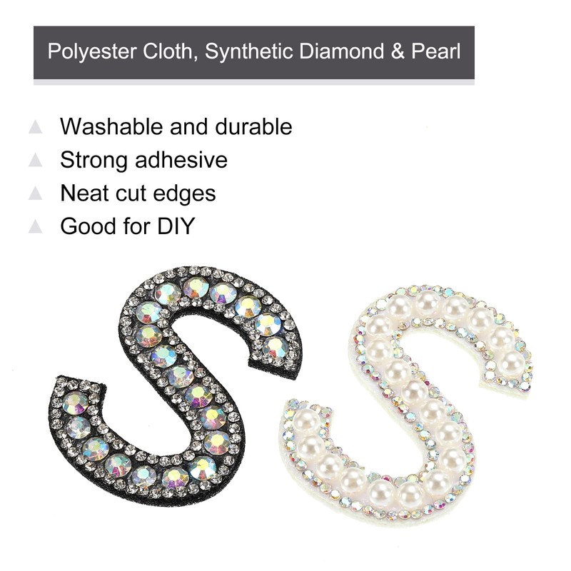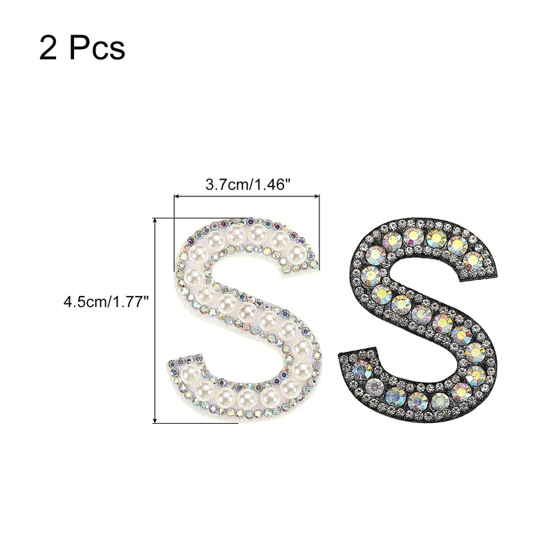 MECCANIXITY Iron on Decorative Letter S Black White Patch Glitter Alphabet Applique Rhinestone Pearl English Letter for DIY Clothes Repair Hats Bags Pack of 2