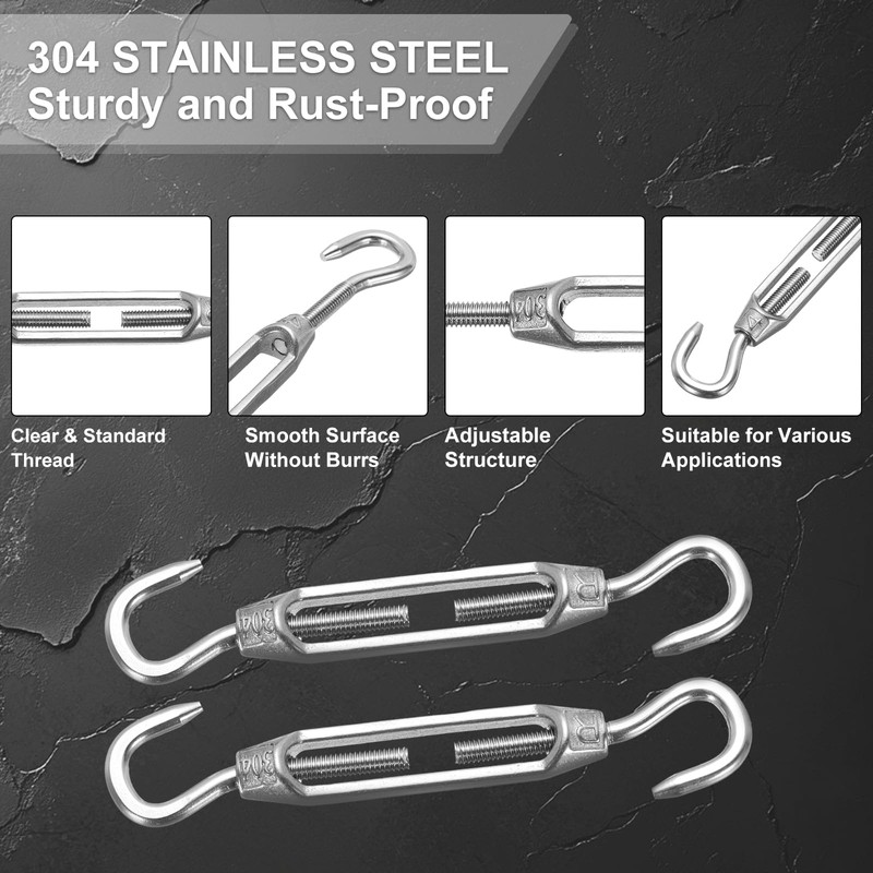 hook and hook turnbuckles are made of 304 stainless steel, which has strong durability and corrosion resistance, solid structure, strong hardness, and will not rust when used in wet environments.
