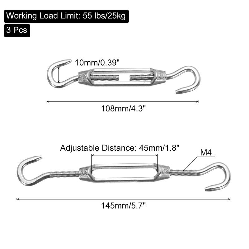 In the package of 3pcs x M4 Hook and Hook Turnbuckles. These are in Min Extended Length: 108mm / 4.3inch, Max Length: 145mm / 5.7inch, Eye Hole Diameter: 10mm/ 0.39 inch, Adjustable Distance: 45mm / 1.8 inch, Working Load Limit: 55 lbs/25kg