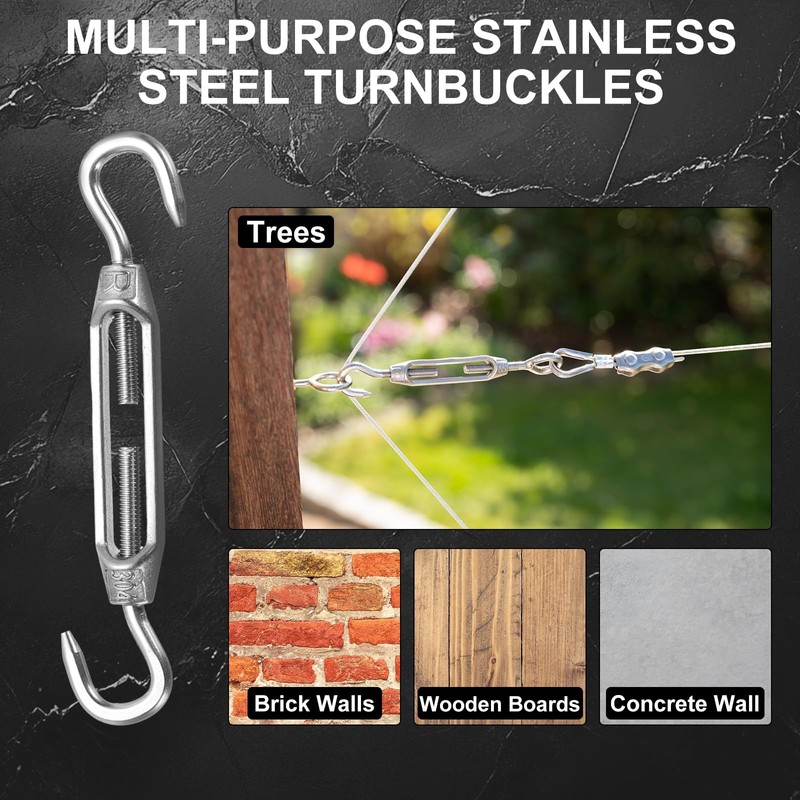 These 304 stainless steel hook and hook turnbuckles are commonly used in rigging, marine, construction, and industrial settings to provide tension and adjust the length of wire rope, cable, and tie-downs in a variety of applications.
