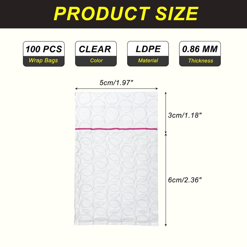 - The Bubble Pouch Wrap Bags We Provide: Size: 6 + 3 x 5 cm/2.36 + 1.18 x 1.97 Inch; Thickness: 6 den/0.86 mm/0.03 inch; Color: Clear; Material: LDPE; Package: 100 Pcs x Bubble Pouch Wrap Bags