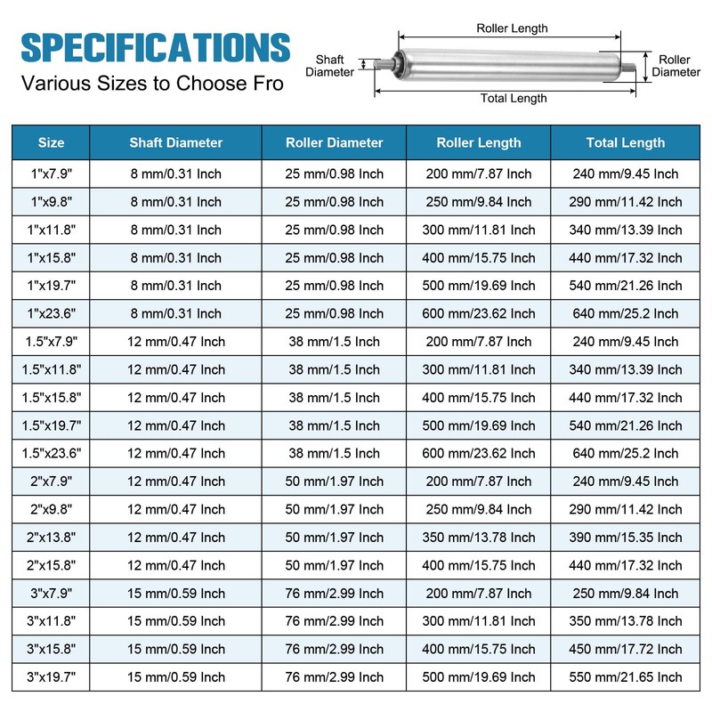 - The package contains 1 pcs conveyor roller, Color: Silver, Material: Stainless Steel, Shaft Diameter: 8 mm/0.31 Inch, Roller Diameter: 25 mm/0.98 Inch, Roller Length: 250 mm/9.84 Inch, Total Length: 290 mm/11.42 Inch
