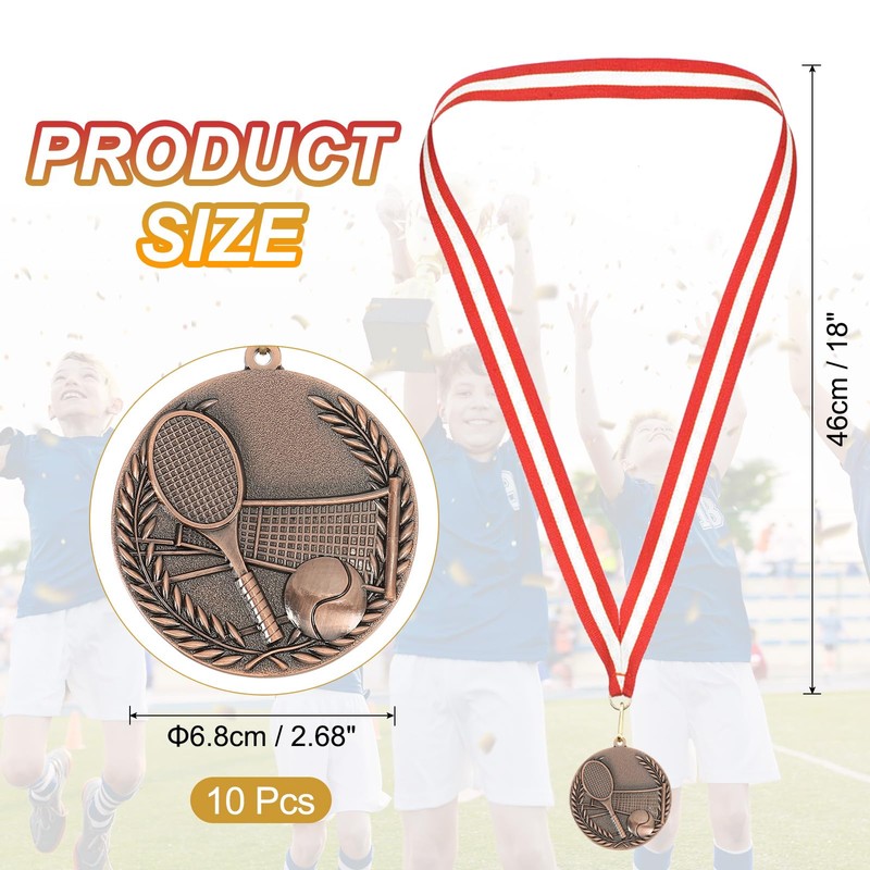 MECCANIXITY Tennis Medals 2.7 Inch, Bronze Award Medals with Neck Ribbon for Team Sports Games Competitions Party Favors 10 Pieces