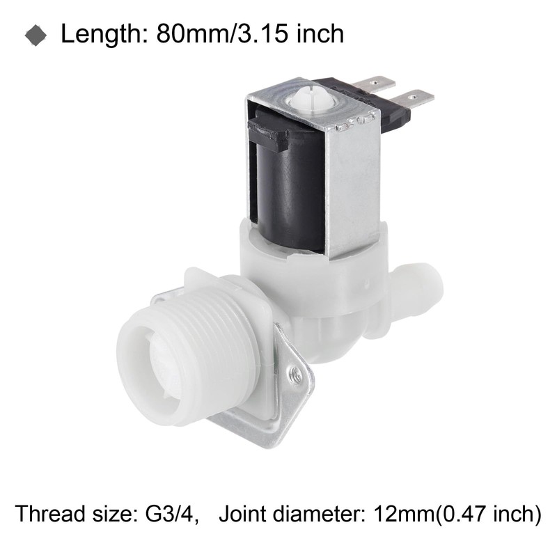 - Water Inlet Valve ,is in size of:Length: Thread size: G3/4,Joint diameter: 12mm(0.47 inch),Length: 80mm(3.15 inch),AC:220v-240v,50/60Hz;In the package of: 1 x Water Inlet Valve