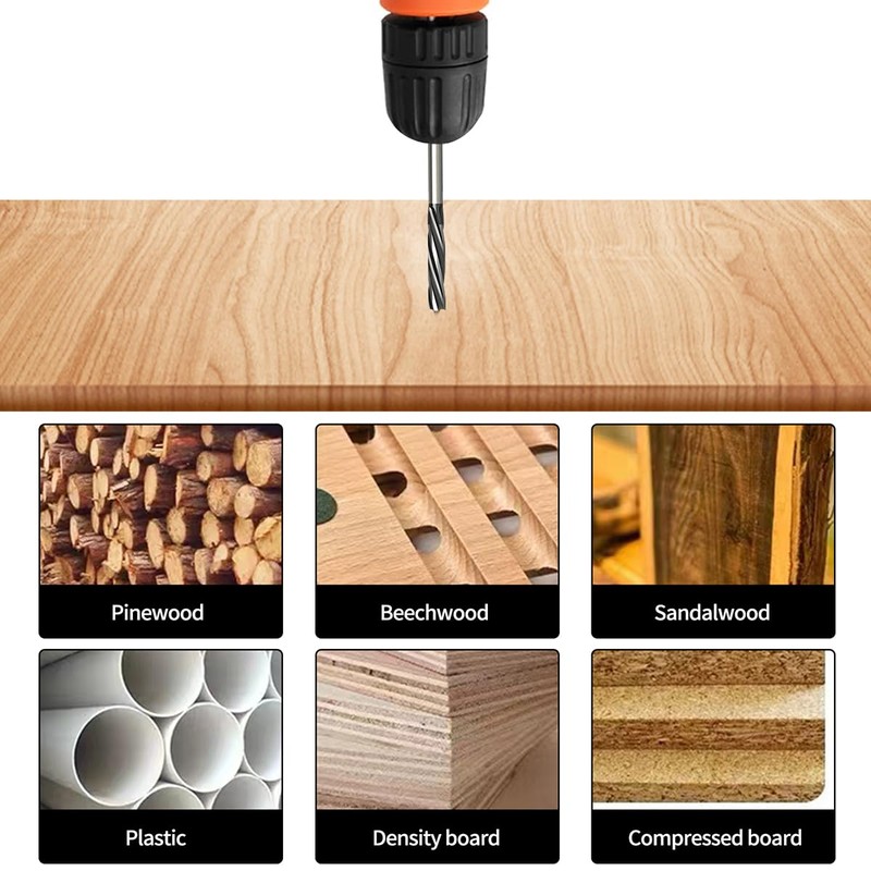 The wood drill bits are engineered and given the capacity to cut through most types of wood, including soft and hardwood, plastics Etc.