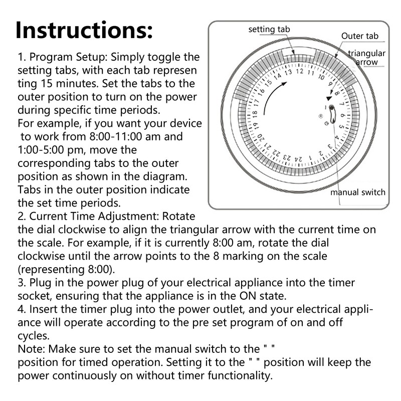 1、MECHANICAL DESIGN: Our outlet timer is built with a reliable mechanical system, ensuring long lasting reliability and durability. With its accurate timing capabilities, you can trust it to accurately control your devices. 2、24 HOUR CYCLE: Set up daily timing tasks effortlessly with our easy to use 24 hour cycle time controller. It allows you to conveniently schedule on and off times for your appliances and devices, giving you complete control. 3、ENERGY SAVING AND ECO FRIENDLY: By using our outlet timer, you can save energy and reduce your impact on the environment. It helps you optimize power usage and minimize unnecessary power consumption. 4、SAFE AND RELIABLE: Our outlet timer is designed compatible with the standard voltage, complying with safety regulations. You can have peace of mind knowing that it meets all safety standards and can be used with confidence. 5、VERSATILE APPLICATIONS: Suitable for a wide range of household appliances and devices, including lamps, TVs, fans, and more. Our outlet timer offers convenience and flexibility for controlling various devices in your home or office.