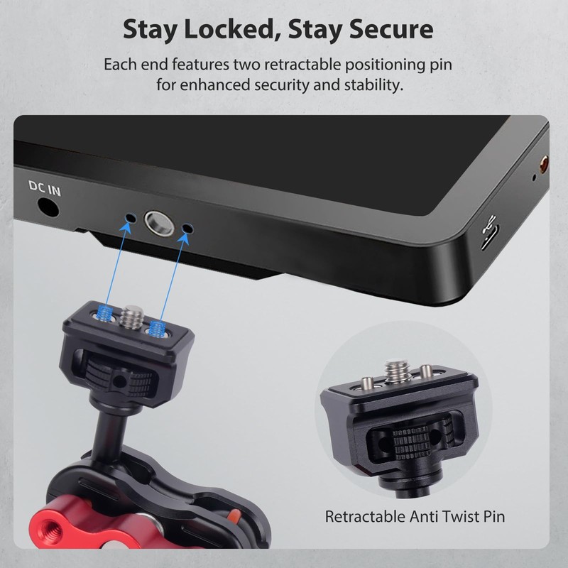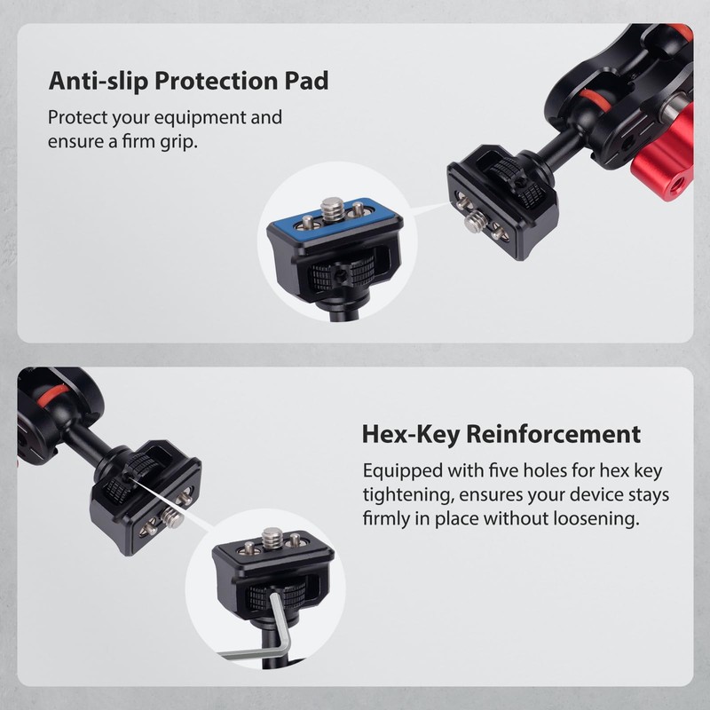 - Reliable Stability and Protection: The magic arm features retractable locating pins and non-slip rubber pads that prevent twisting and protect your equipment. Built to withstand rigorous shoots while safeguarding delicate gear, it ensures a stable and secure hold, even during dynamic filming