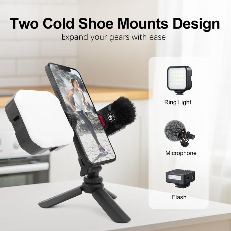 - Dual 360 Cold Shoe Mounts for Accessories: Attach a ring light and microphone simultaneously via two rotating cold shoe mounts. Adjust angles to eliminate shadows or glare, whether filming unboxings, podcasts, or late-night study sessions. No more juggling separate holders for lights or mics