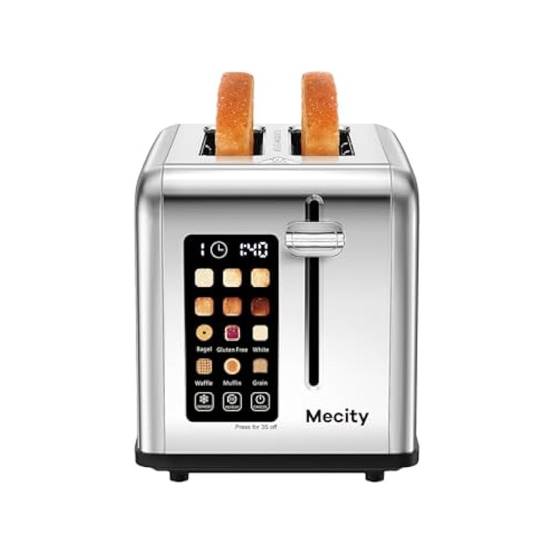 Mecity 2 Slice Toaster Touch Screen 1.5" Wide Slot, Stainless Steel Smart Bread Toaster for Bagel Muffin Waffle Gluten Free Breads, Timer, Defrost, Reheat, 120V 825W
