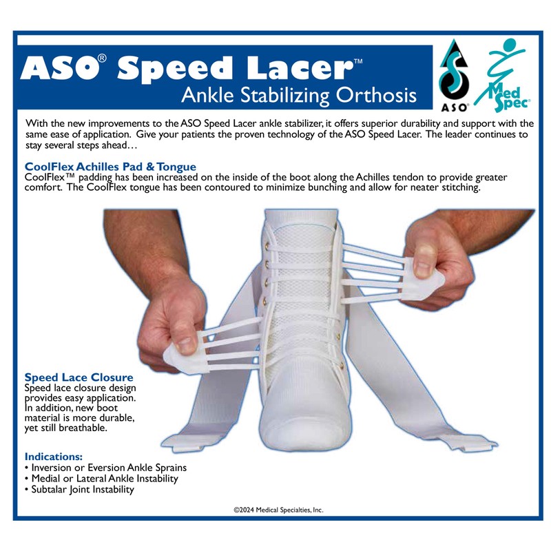 Product DescriptionAso speed lacer ankle brace the aso speed lacer ankle brace is a great choice for preventing or treating ankle sprains. The quick lacing feature makes the speed lacer different from regular aso. Two hand held tabs allow the patient to tightly close the brace without having to remove the laces. Elastic cuff closure: Decreases amount of inversion possibleballistic nylon straps: "figure 8" straps replicate ankle tapinglow profile: Will fit in any type of shoelace up closure: Patient friendly applicationbilateral capability: Helps keep foot in neutral positionballistic nylon base: Provides tremendous strength to product, increase longevity of braceknitted nylon boot: Easy applicationvelcro lace closure: Enhanced breathability for long term wearus manufacturing: Higher quality control standardseach brace is sold separatelyin stock for immediate shipment indications the aso speed lacer ankle brace is indicated for moderate to severe inversion or eversion sprains. High ankle sprains. Chronic ankle instability. Goals moderate stability. Prevent sprains/strains. Decrease anti inflammatory medications. Decrease pain symptoms. Improve joint function. Maintain flexibility.Manufacturer Contact InformationMedical Specialties Inc., 460-K Lebanon Road, Charlotte, NC 28227, 704-573-4040, request@medspec.com