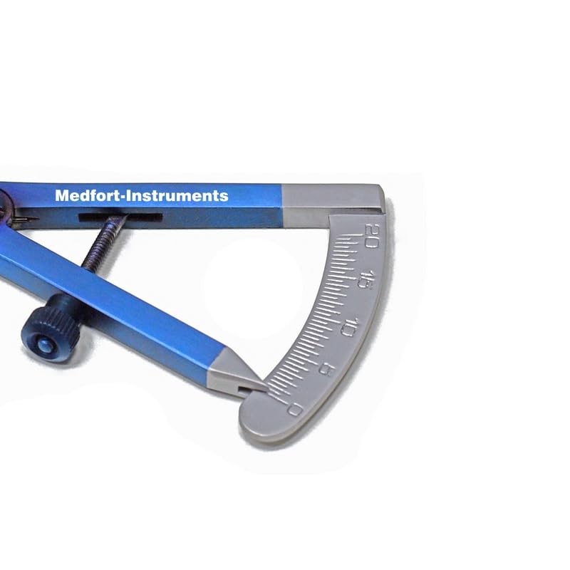 Introducing the Castroviejo Caliper from Medfort Instruments, a precision measuring tool designed for medical professionals. Crafted with meticulous attention to detail, this caliper boasts an 8cm length and an impressive 20mm measuring range. Its sleek blue anodized aluminum construction ensures durability and longevity, while the etched markings on the stainless steel jaws provide clear and accurate measurements. Whether you're performing delicate procedures or taking precise readings, the Castroviejo Caliper offers unparalleled reliability. With its ergonomic design and easy-to-read scale, this caliper is an indispensable instrument for any medical setting. Elevate your practice with the precision and quality of the Castroviejo Caliper from Medfort Instruments.