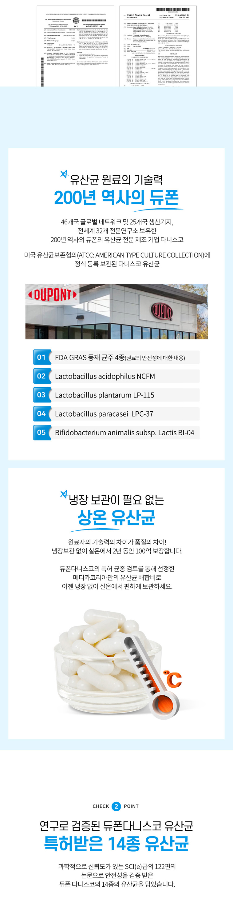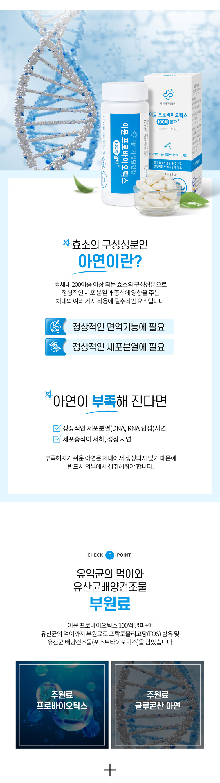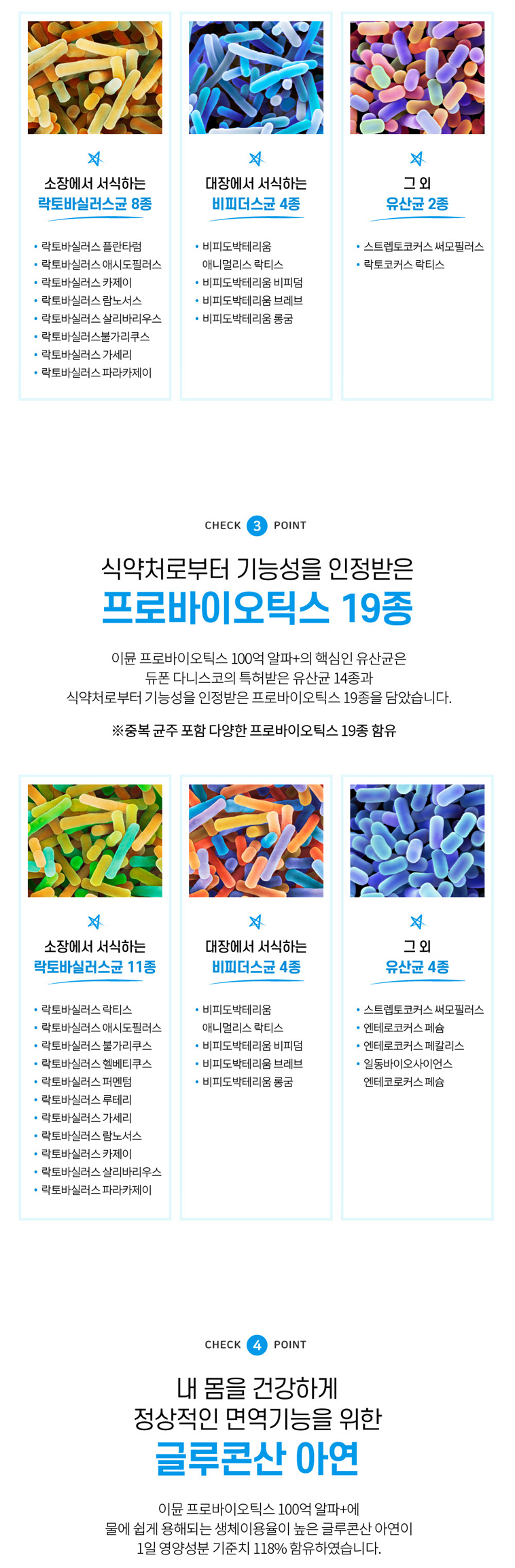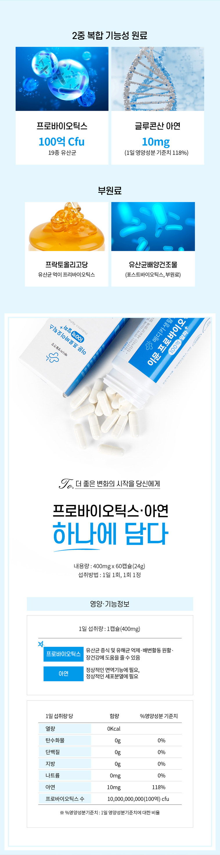 - 원(재)료명 및 함량: 엔테로코커스 페슘,글루콘산아연,락토바실러스 팔란타럼,락토바실러스 애시도필러스,락토바실러스 카제이,락토바실러스 람노서스,스트렙토코커스 써모필러스,락토바실러스 살리바리우스,바피도 박테리움 애니멀리스 락티스,비피도박테리움 비피덤,비피도박테리움 브레브,비피도박테리움 롱굼,락토바실러스 불가리쿠스,락토바실러스 가세리,락토바실러스 파라카제이,락토코커스 락티스,유산균혼합분말,결정셀룰로스,혼합유당(유당,덱스트린),스테아린산마그네슘,프락토올리고당,유산균배양건조물,무수결정포도당
