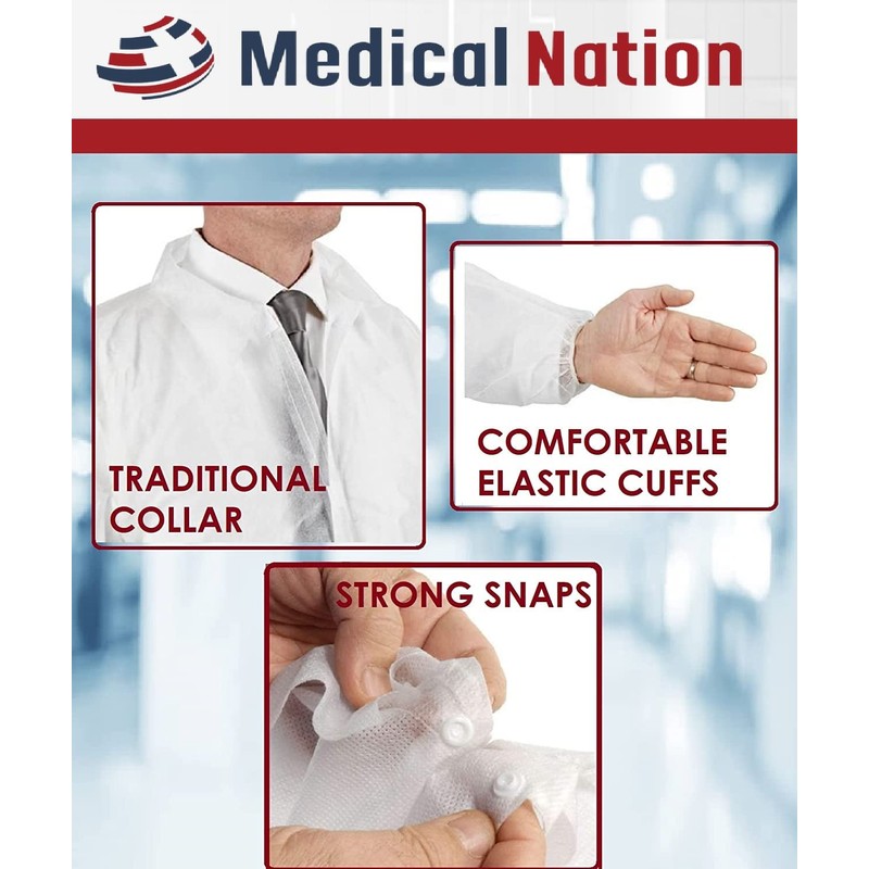 Medical Nation Medical Nation Disposable White Lab Coats | Case of 30, Large | Durable Lab Coat for Unisex Adult, Latex-Free, PPE Protective Coat with Snaps, Perfect for Hospitals, Pharmacies, Labs, Clinics