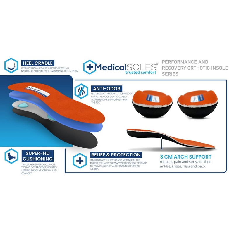 - RECOVERY FOOTBED AND PODIATRIST-DESIGNED UNISEX INSOLES: Our Medical SOLES full-length insoles are medically designed by medical professionals to provide custom-grade orthotic solution and relieve extreme pain with maximum arch support and highest-end cushioning. Our orthotic inserts provide a ton of stability and keep the base of your foot aligned while the foot bones are kept vertical and in balance.