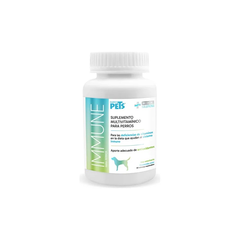 Multivitamínico Immune de Fancy Pets® Medical Solutions es un suplemento formulado para fortalecer el sistema inmune de tu perro. Contiene antioxidantes y vitaminas esenciales que apoyan las defensas naturales, ideal como coadyuvante en enfermedades infecciosas o autoinmunes.