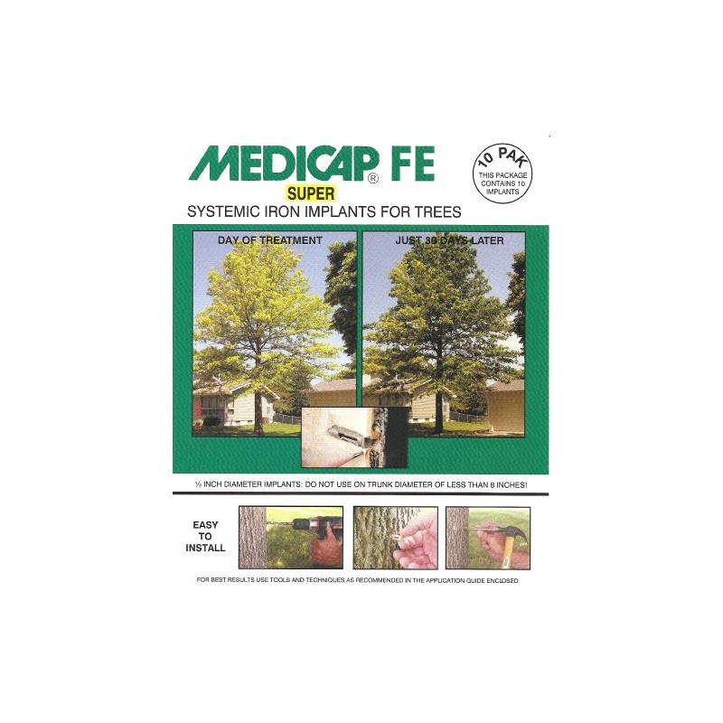 Medicap FE 1/2" SUPER iron systemic implants are useful in all types of trees with iron deficiency, a condition known as chlorosis. Such deficiencies are normally associated with calcareous, arid or sandy soil conditions. Trees most susceptible are oak (pin oak and white oak), black locust, eucalyptus, birch, sweet gum (liquid amber), pine, magnolia, sycamore, dogwood, podocarpus, poplar, catalpa, citrus, peach, pear, apple, avocado and silver maple. One treatment will last for 2 to 3 years. Medicaps are easily installed by tapping the implants with a hammer and bolt or dowel rod into pre-drilled 1/2" diameter holes in the lower tree trunk at 4 to 6 inch spacing. The cartridge head securely plugs the small wound made to the tree trunk and the active layer of cambium will soon grow over and close the implant site. Under normal moisture conditions, the chemical will move throughout the entire tree within 14 to 21 days for quick Greenup. 10 Medicaps will treat a 14 inch diameter tree. These 1/2" SUPER implants are for trees with a trunk diameter of 8" and larger.