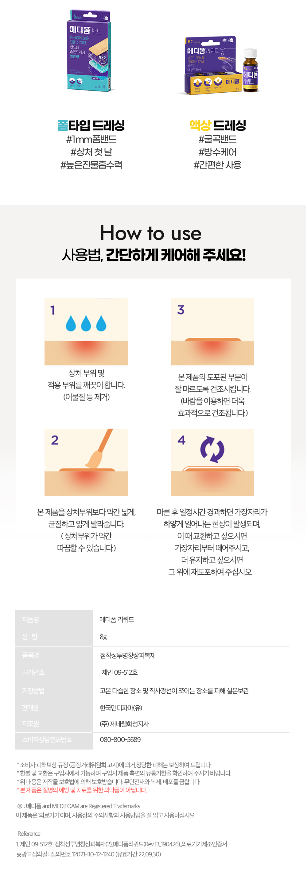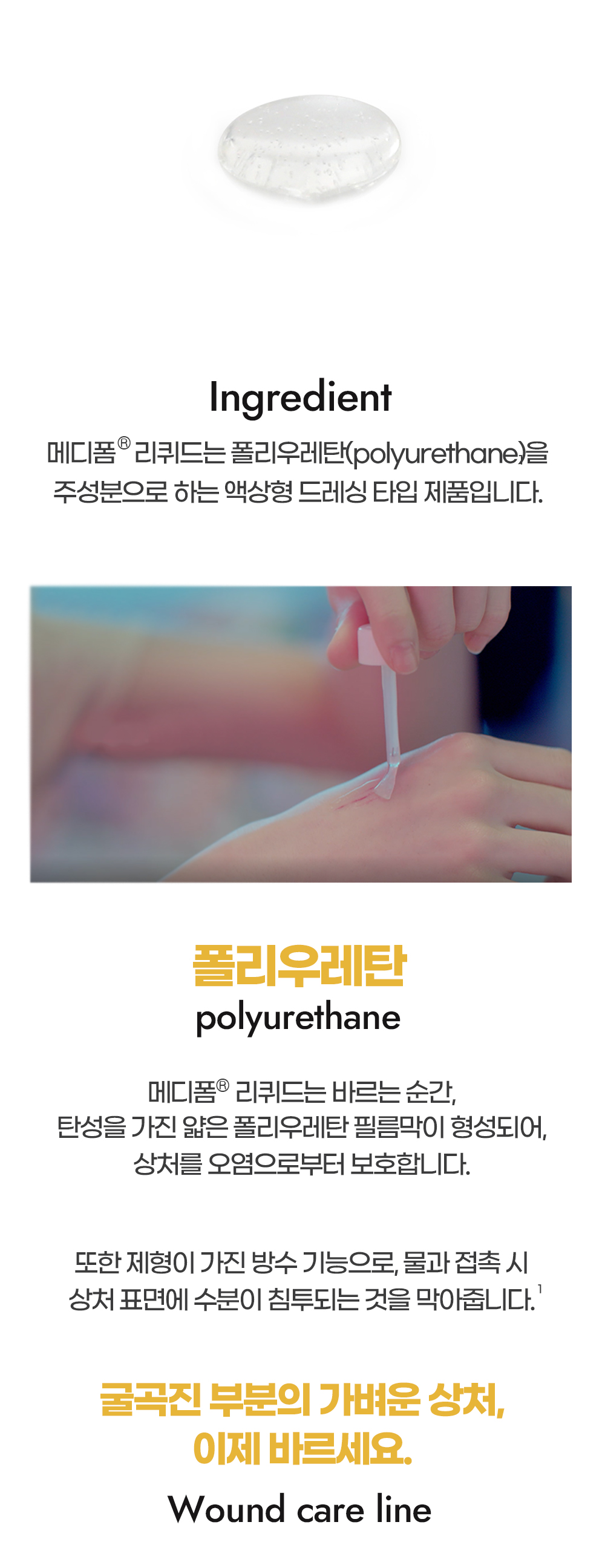 Mediform Liquid (8g), a waterproof liquid dressing to prevent contamination and protect curved areas / 메디폼 리퀴드(8g), 굴곡진부위 오염방지 보호 바르는 방수형 액상드레싱