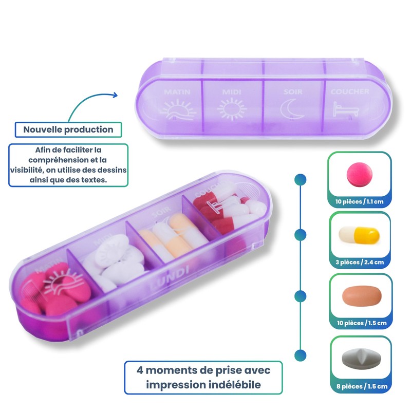 - ️ WEEKLY ORGANIZATION Pill box with 7 pens, each divided into 4 compartments for morning, noon, evening and bedtime. Ideal for planning your medication for a whole week.