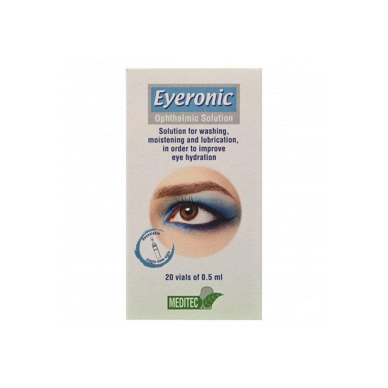 Opthalmic solution containing hyaluronic acid for eye washing, moistening and lubrication, in order to improve eye hydration. Marketed in a one-day vial with a patent for reclosing, convenient for patient use.