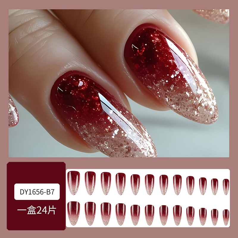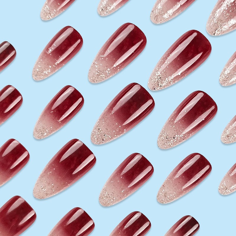 Medium Almond Press on Nails Gradient Wine Red Fake Nails Glitter Nail Tips Designs Cute Acrylic Nails French Tip Glue on Nails Reusable Artificial Nails Medium Length Stick on Nails for Women, 24Pcs