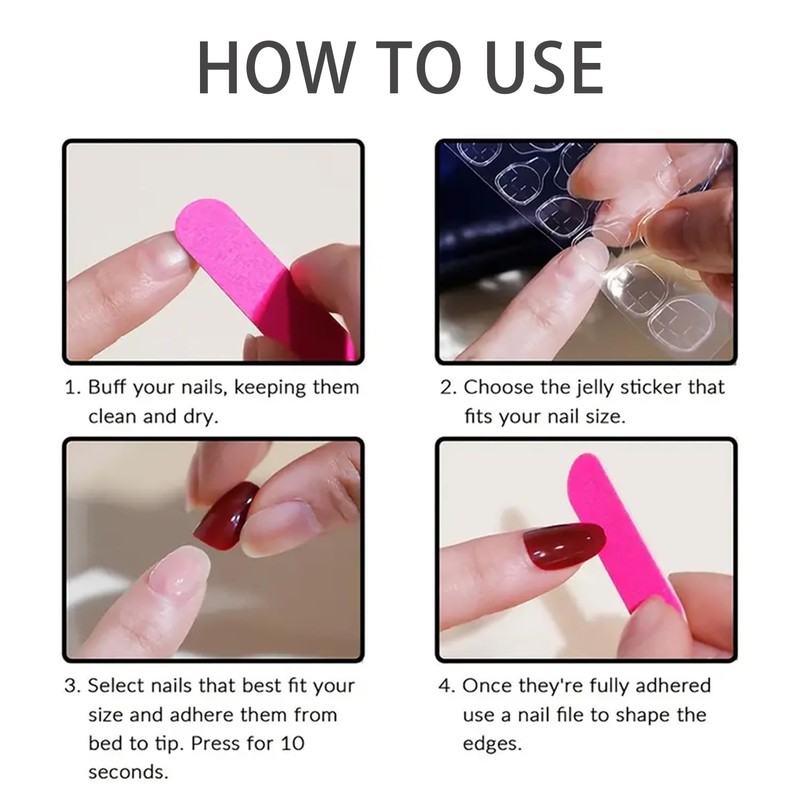 1.Gently polish the nails and false nails with our complimentary nail file to get a better fit.