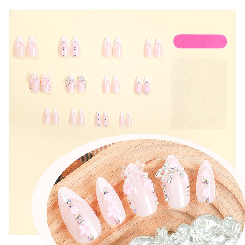 Medium Almond Press on Nails White French Tip Fake Nails with 5D Bow Flower Pearls Rhinestones Designs Decorate Nail Press ons Nude Full Cover Fashion Manicure Glue on Nails 24Pcs