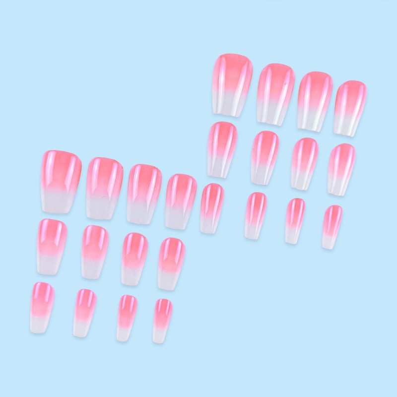 Medium Coffin Press on Nails Cute Pink Gradient Fake Nails with Design Glossy Acrylic Stick on Nails Pink White False Nails French Tip Glue on Nails Reusable Ballet Nails for Women Girls 24Pcs