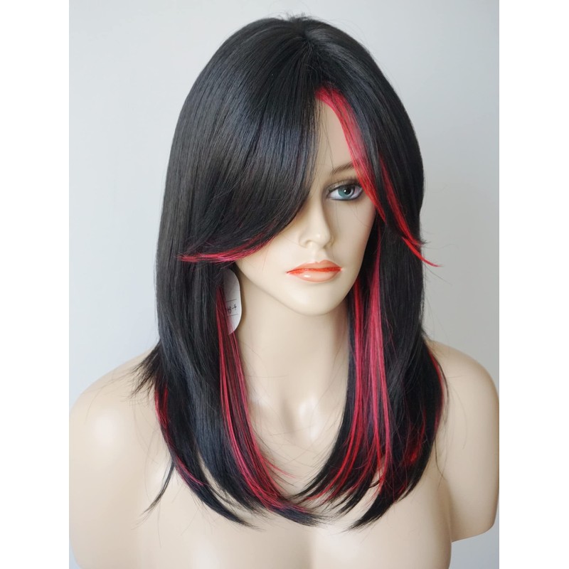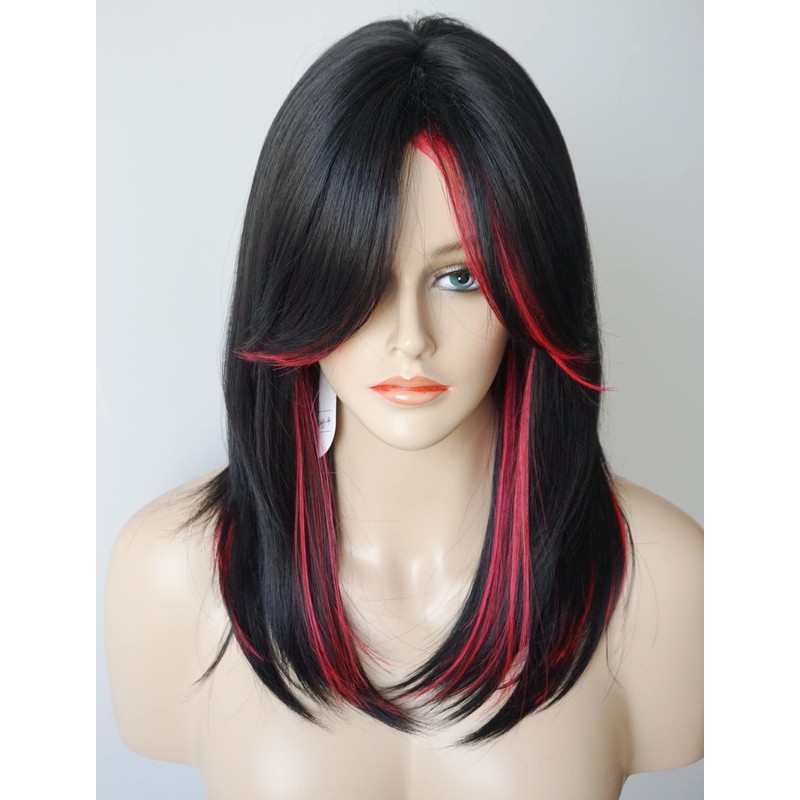 Medium Length Layered Wigs Black with Red Highlights wigs Layered wig with bangs Synthetic wig Highlight for white Women (Black with red)