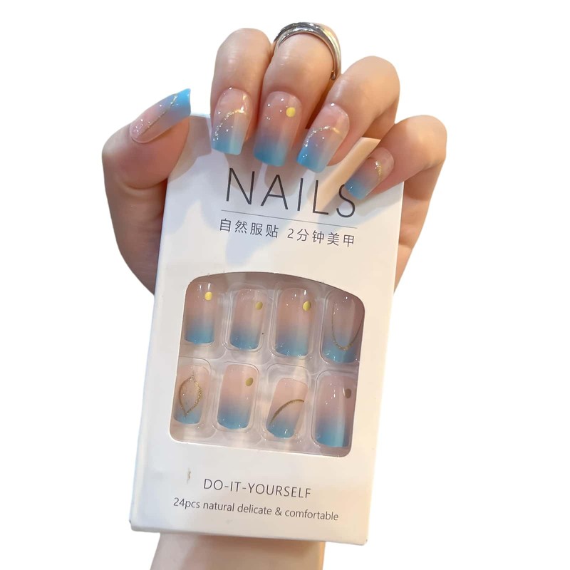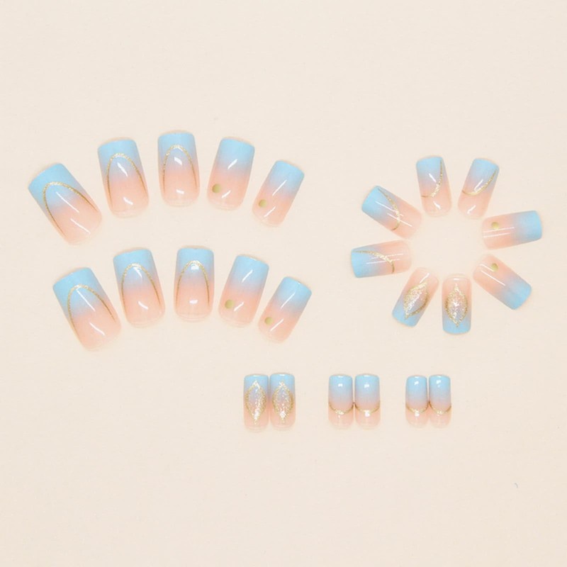 • Beautiful and fashionable:Medium nude gloss fake Nails finger tip with blue gradient gold lines designs a touch of sophistication and charm to the hands.