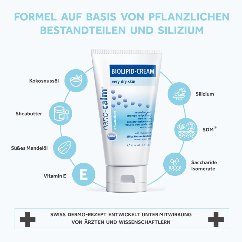 Application: Apply nano-calm BIOLIPID CREAM care cream thinly once or twice a day to the affected skin areas or face. After washing, reapply the affected skin areas. The skin cream absorbs quickly and leaves an elastic, strengthened and visibly smooth complexion.