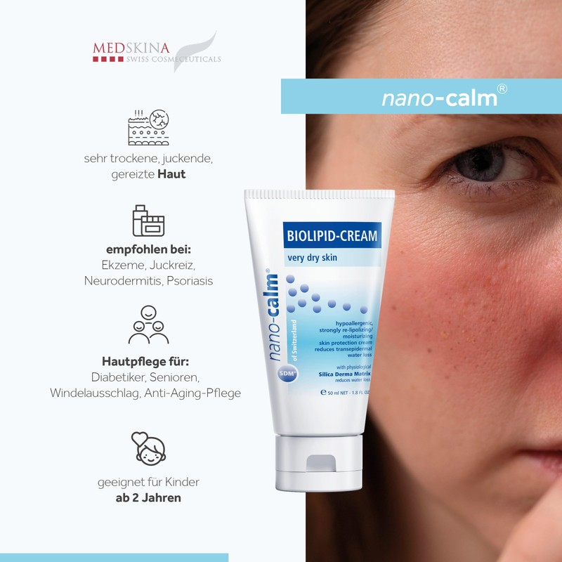 The care cream nano-calm BIOLIPID CREAM with the patented nano-biological triple action formula offers 24H skin and moisture protection for very dry, irritated and reddened skin. The