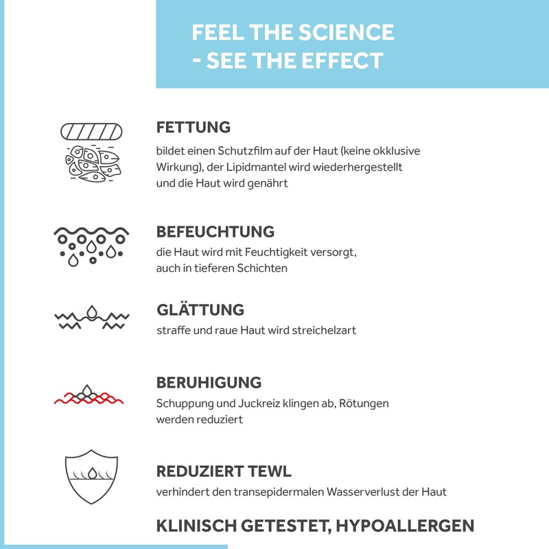 The highly effective skin care formula with pH 5.5 is ideal for daily care of irritated, flaky and itchy skin. It is specially designed for accompanying care for eczema, psoriasis and diabetic skin. The skin cream is hypoallergenic tested and is tolerated very well even by sensitive skin. It is free from perfume, dyes, emulsifiers, parabens and preservatives. This makes it suitable for the care of damaged, sore skin and has a preventive effect for nappy dermatitis and bedsores in children and adults. The cream is for skin care in children from the 2nd age and suitable for bedridden people.