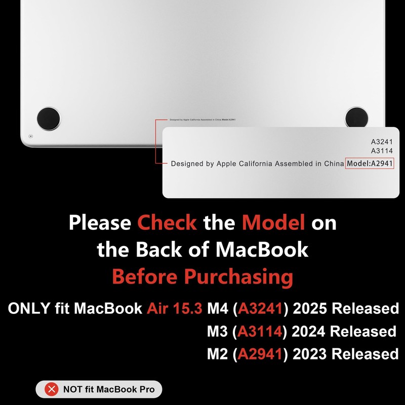 - Check Model for MacBook: Case Only for M4/M3/M2 MacBook Air 15" 2025 2024 2023 Released (Only compatible model: A3241/A3114/A2941). Please check the specific model "AXXXX" on the back of MacBook before purchasing