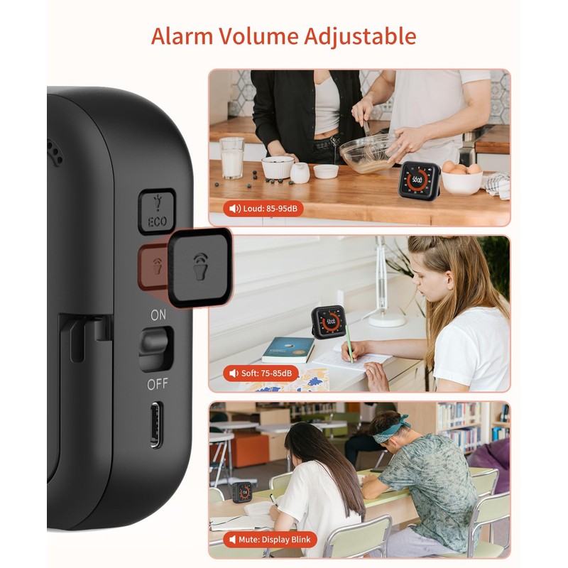 - 【Alarm Volume Adjustable and Totally Silent】You have 2 volume options: Loud (85-95dB), Soft (75-85dB). Or you could set it to Mute to keep it silent but allow the numbers flash. The alarm time will last for one minute