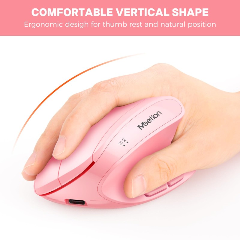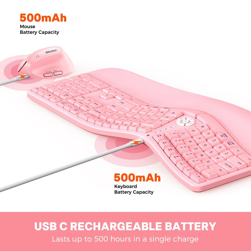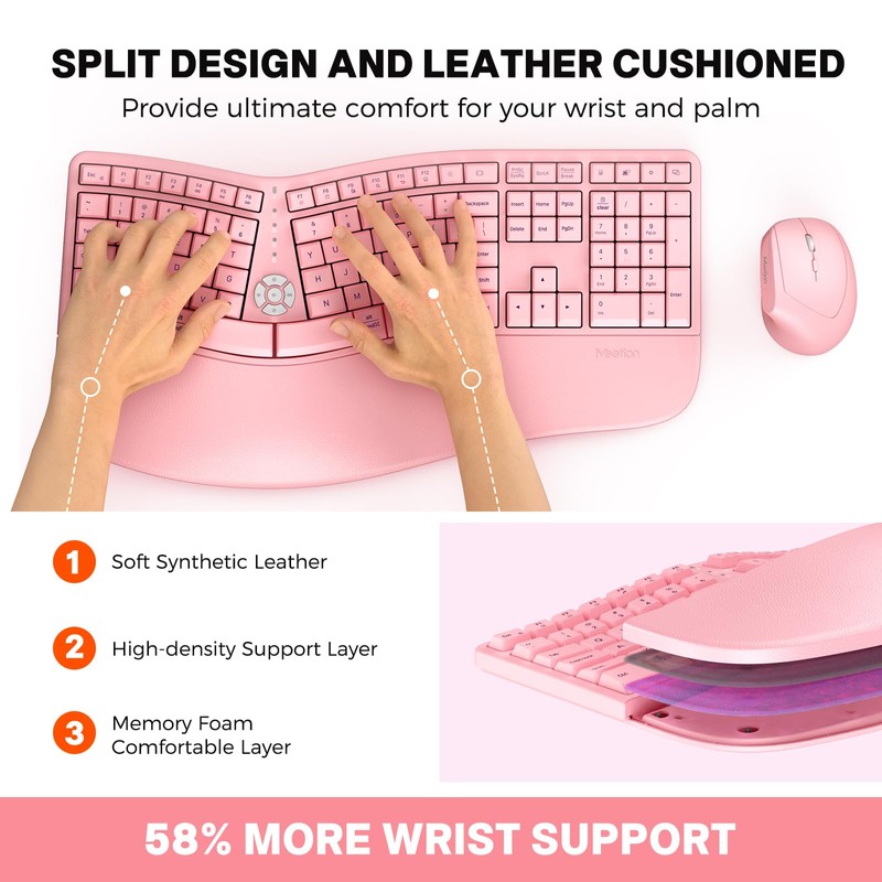 MEETION Ergonomic Keyboard and Mouse, 2.4G USB Wireless Split Keyboard with Soft Palm Rest, 4 DPI Adjustable Vertical Mouse, Full Size Rechargeable Windows/Mac/Computer/Laptop, Pink
