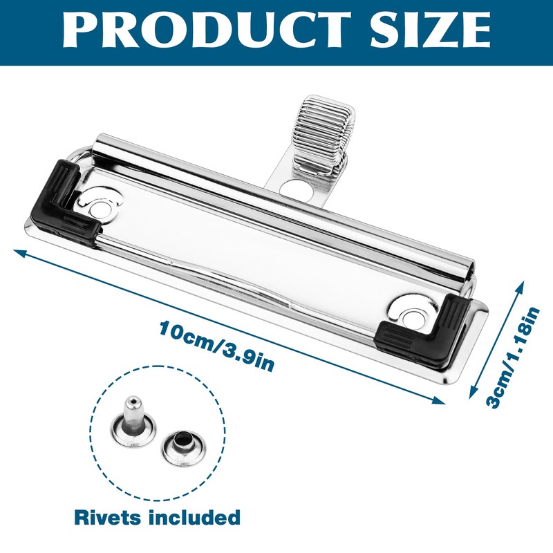 - Package contents: 10 folding box clips and 20 pairs of matching rivets, size approx: 10 x 3 cm, it can hold up to 80-100 sheets of plain paper, for attaching to clipboards.
