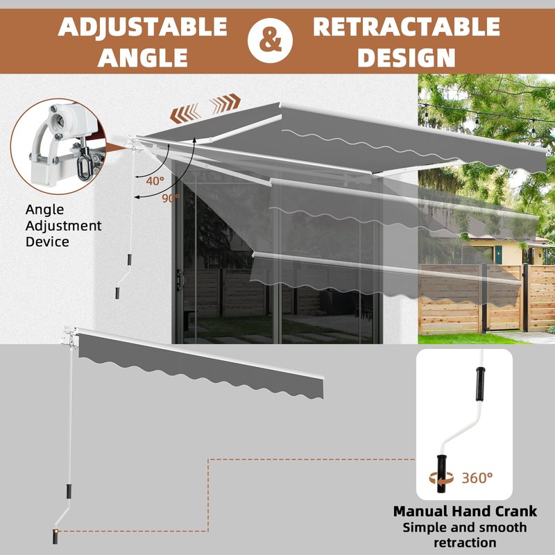 - 【Effortless Length & Angle Adjustment】The patio awning is equipped with a long 5.3′ hand crank on the left for easy adjustment. Simply rotate the hand crank clockwise or anticlockwise to open, adjust, and close the awning cloth effortlessly, and will not block the view when contracted. The awning angle can be set from 40° to 90° to suit your needs, and is easily adjustable to provide better shading according to different sunshine exposure and a certain level of privacy.