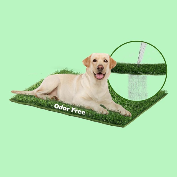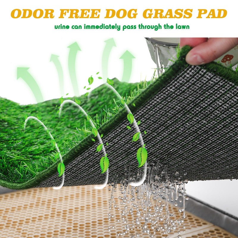 - ADVANTAGE 2 - NO ODER : Ordinary pet artificial lawns have a foul odor, mainly because the black rubber bottom will permanently absorb urine and cannot be cleaned thoroughly. The INSTANT-PENETRATION dog potty grass pad does not have this issue because it is KNITTED and MELTED