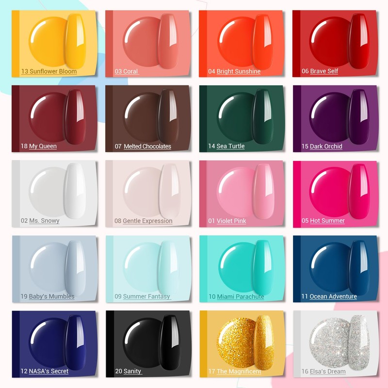 - Nice Box: MEFA 20 X 7ml Summer Neon Colors Gel+ 7ml Base Coat, No Wipe Shiny Gel Top Coat & Matte Top Coat, no need to purchase the base and top coat separately. This summer gel nail polish colors set has a wide range of colors at your fingertips